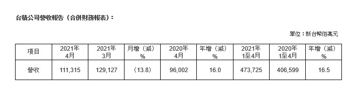 台积电今天公布了其2021年4月的营收情况:2021年4月合并营收约为新台币1113.15亿元,较上月减少了13.8%,较去年同期增加了16.0%。累计2021年1至4月营收约为新台币4737.25亿元,较去年同期增加了16.5%。